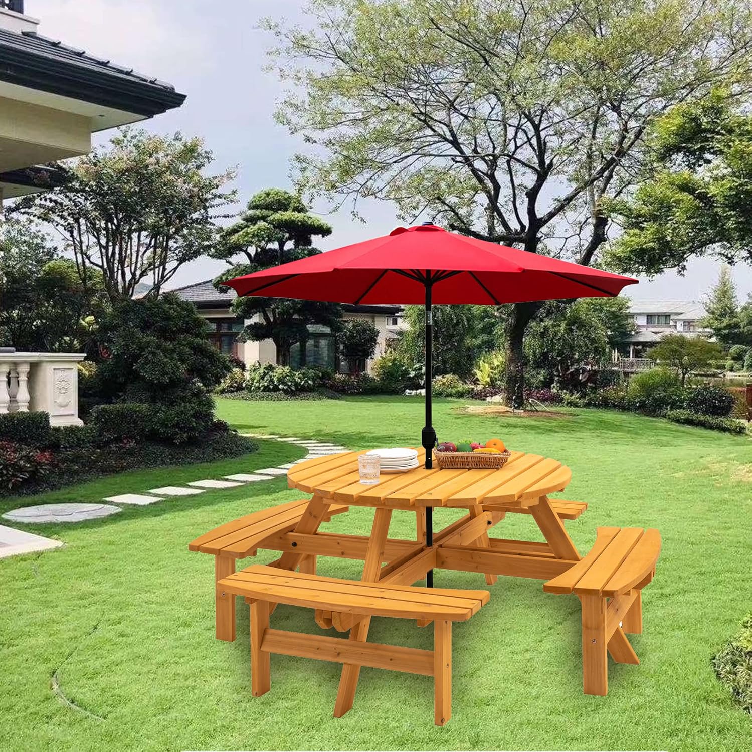 10-12-person Round Outdoor Wooden Picnic Table for Patio, Backyard, Garden, DIY with 1 Built-in Ring Stool, 500-lb Weight Capacity - Walnut BrownSpecificationMain Color: BrownMain Material: WoodSize:70.4"L x 70.4"W x 27.55"HMaterial: Fir WoodTable Dimensions: 43.3"(D) x 27.55"(H)Diameter of Umbrella Hole: 1.97"Product Features【Natural Wood Grain】The natural wood grain makes it perfect for creating a delightful DIY experience, and you can paint the set to suit your personality or outdoor environment; Table size: 43.3 inches (diameter) x 27.55 inches (height); Load-bearing capacity: 1,500 pounds.【Capacity for 12 people】Each bench can bear 500 pounds, allowing your family to gather on the connected benches to enjoy food and company. Two adults can be on the left and right sides of the child, making it convenient to take care of child.【Umbrella Ready】A built-in 1.97" umbrella hole in the center of the round table fits most standard patio umbrellas(not included), providing shade and protecting from rain. An additional fixed hole helps keep the umbrella in place.【Rustic Charm】With its natural wood grain design, this wooden picnic table with umbrella hole adds a rustic touch to outdoor setting. Ideal for patios, gardens, poolside areas, or backyards, place it on the patio, in your garden, or underneath your favorite tree.【Easy to Assemble】This 8 person outdoor picnic table comes with clear instructions and all necessary accessories for installation. The smooth surface makes cleaning easy.