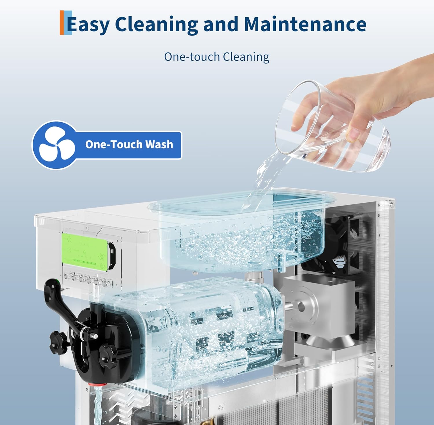 LCD Panel: This machine is equipped with a clear LCD display that intuitively shows the temperatures of the mixing cylinder and hopper, as well as the ice cream production volume, making operation easier. You can adjust the portion size, hardness, and temperature to suit different taste preferences.One-Touch Cleaning: The ice cream machine features a one-touch cleaning function. Before making ice cream, simply pour clean water into the hopper and press the cleaning button for automatic cleaning. After a short wait, pull down the handle to drain the wastewater from the outlet.Wide Application: This countertop soft serve ice cream machine is suitable for various venues, including family snack shops, cafés, bubble tea shops, and restaurants. It is an essential multifunctional commercial ice cream machine for dessert lovers or business owners.