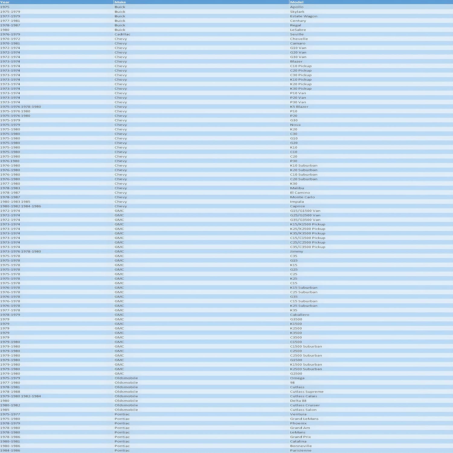 This AA5052 Aluminum Radiator is designed to provide maximum cooling efficiency to prevent premature engine failure. Its light-weight, and high-heat transferring aluminum features a tube and fin design that, dramatically increases surface area that enables the heat to dissipate more efficiently. This AA5052 Aluminum Radiator is at least 30%-45% more efficient than stock ones. Most importantly, it has a much higher capacity for coolant than stock ones, which means that your cooling system will be more efficient and will be more resistant to temperature surges in racing applications.Vehicle Fitment:For Chevy Nova 75-79 /Chevy Camaro 70-80,For Chevy/GMC G Series 1970-1985 ,For Chevy C10-C20 C-Series 1970-1985,For Chevy Monte Carlo 1983-1987,For Chevy Blazer 1973-1985,For Chevy El Camino 78-1987,For Chevy Suburban 1976-1980,For Chevy Impala 1980-1985,For GMC C25-C3500 C-Series 1970-1985For Oldsmobile Cutlass 1978-1988Manufacturer Part Number: DPI162,CC162,CU162,SBR162FIT 26 1/4" WIDE CORE ONLYRadiator Detail:Material: AA5052 Aluminium3-Row of tubes Core Racing DesignCore Thickness: 2"Core Dimensions: 16 6/7" H x 26 2/9" W Overall Dimensions: 18 1/2" H x 31 5/7" W Inlet Diameter: 1-1/2" Outlet Diameter: 1-4/7"Trans Cooler: φ32*215*G1/4Mount Type: Saddle