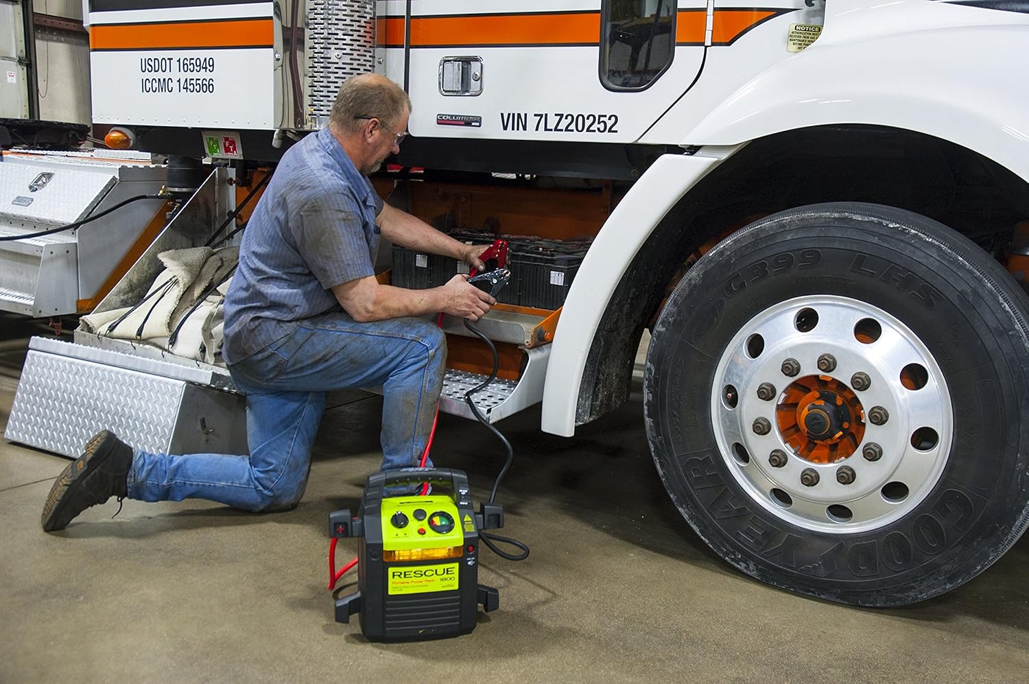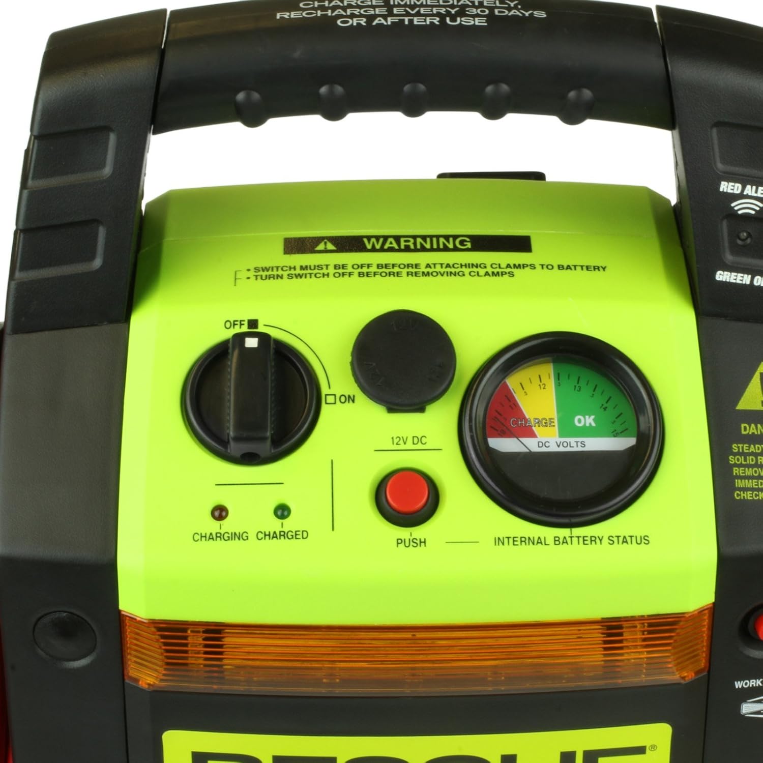 Rescue Pack 1800. Features: Jumpstarts 12 volt vehicle Two heavy duty 20 Amp hour batteries Built in work light and flasher Extremely long 62" cables Safeguard audible signal and light Battery status gauge DC Power source 15 1/2≴ L x 8≴ W x 14≴ H class="floatimageleft"/>