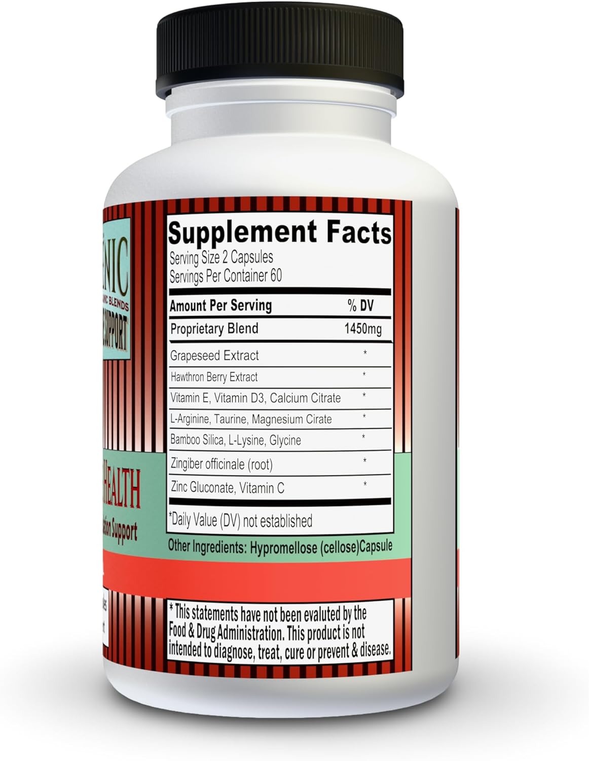 | Special Ingredients | L-Arginine | Taurine | Vitamin E | Zinc Ortate | Magnisum Citrate | Vitamin D3 | Calcium Citrate | GrapeSeed Ext | Hawthorn Berry Ext | Pomegranate Berry | Beet Root | Ginger | Bamboo Silica | |