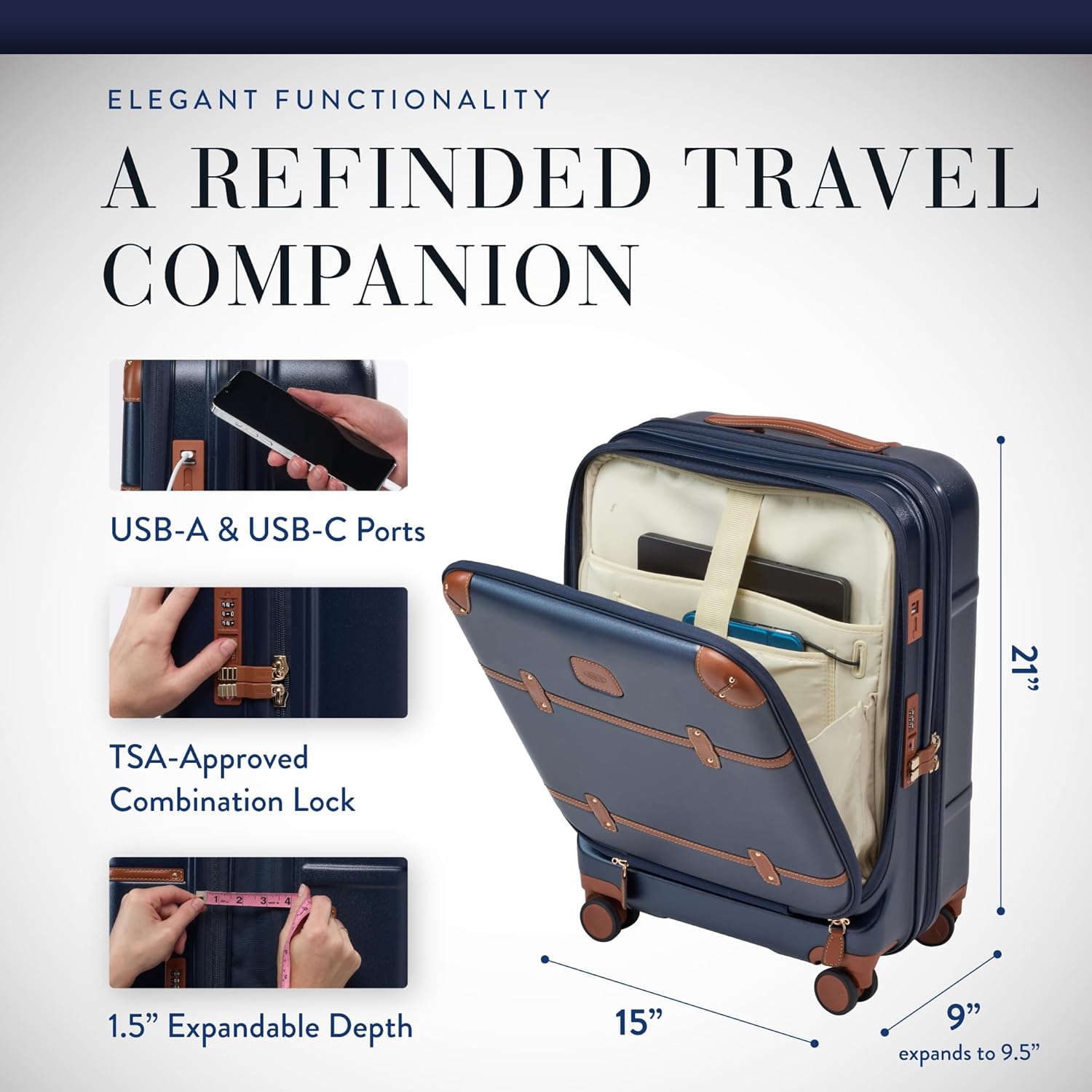 Discover where luxury and adventure meet with Bric's designer luggage. The Bellagio 3.0 suitcase updates our timeless travel suitcase with full-grain Italian leather trims, a 1.5" expandable design, and a transparent protective cover. Choose from our selection of rolling carry on or checked luggage, each piece has a lightweight yet ultra-durable polycarbonate shell with four 360-degree wheels, an ergonomic telescopic handle, removable lining, and a two-compartment internal compression system to help you pack. Arrive in style no matter your destination with Bric's. Note: the full-grain leather details should not be exposed to rain or humidity, if this occurs pat dry and allow to dry completely, away from heat, before storing.
