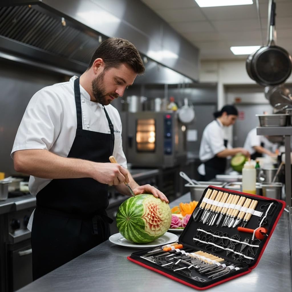 Item Name:Culinary Carving Tool Set Fruit Vegetable Food Garnishing Cutting Slicing Peeling Culinary Garnish Tools Kit (80 pcs) with Portable Upscale Red Gift BoxOur carving tool set contains 80 different carving tools, it is like a "Carving Tool Family". You could carve many different beautiful shapes on fruits and vegetables. It is convenient to carry and easy to clean. The handle of the carving knife is made of wood or plastic and is comfortable to use.Features:Made of chrome steel, rustproof, healthy and durable to use.80PCS different carving tools, you could use them to carve beautiful shapes on many kinds of foods, fruits, vegetables and cakes.All the carving tools are packed in the case, it is very easy to store and convenient to carry. The carving knives have a wooden or plastic handle, they are all very easy to use.Easy to clean, sponge wash and then dry for next use. Please be careful when you wash them.Specifications:Material: chrome steelCase size: Approx. 40 x 30 cm / 15.7 x 11.8 inQuantity: 80 piecesPackage includes:80 x carving tools