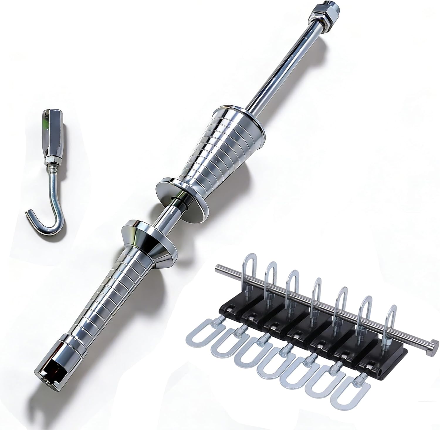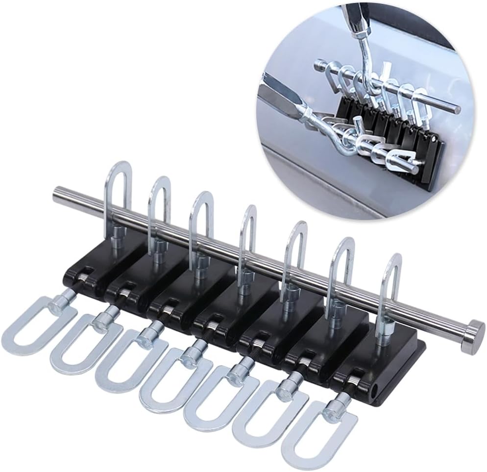 This professional paintless dent repair kit is an essential tool for automotive enthusiasts and body shop professionals looking to restore their vehicle's appearance without costly repainting. The kit features a durable slide hammer mechanism that provides controlled pulling force to effectively remove dents, dings, and creases from auto body panels. The lockable aluminum puller tab ensures a secure grip during the repair process, allowing for precise dent extraction while maintaining the original factory finish. The ergonomic design with textured grip handles provides comfortable control during extended use, while the chrome-plated construction offers long-lasting durability and corrosion resistance. This comprehensive dent removal system includes multiple pulling tabs and hooks to accommodate various dent sizes and locations, making it versatile enough to tackle everything from minor door dings to larger panel imperfections. The kit comes with organized storage components to keep all pieces readily accessible and protected when not in use. Whether you're a DIY car owner or a professional technician, this paintless dent repair kit delivers the precision and reliability needed to achieve smooth, factory-quality results without the expense of traditional body work.