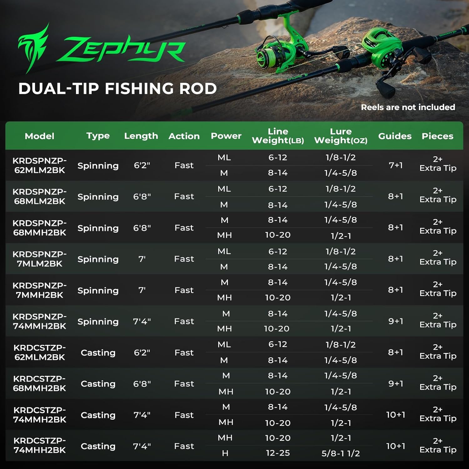 The KastKing Zephyr Dual Tip Rods are built for anglers seeking a lightweight, durable, and highly sensitive rod that performs across various fishing conditions and different species. Made from lightweight KastFlex IM6 Graphite material, Zephyr rods offer the ideal combination of power, durability, and sensitivity.Zephyr rods are finished with Fuji O-ring guide. The high-quality guide provide smooth, low-friction line flow, which increases casting distance and protects all types of line, Mono, Braid or Fluorocarbon. The 360-degree protection offered by the Fuji O-rings keeps the line intact and minimizes the risk of tangles. Whether you’re fishing in fresh or saltwater, this guide system guarantees consistent performance, delivering smooth, long casts and retrievals.The ultralight fishing rod is also equipped with a unique interchangeable dual power tip design, offering the versatility to adapt to different fishing conditions. Both tips are equipped with Fuji O-rings to maintain smooth line flow throughout your cast, ensuring that your fishing experience is effortless and enjoyable.In addition to these features, the fishing rods also include a strategically positioned Drop Shot hook keeper near the reel seat, which works with Drop Shot rigs, hard baits and individual hooks. The rods are also outfitted with high-density black EVA grips on the front, handle, and rear, ensuring maximum comfort and control even in challenging conditions. For added convenience, the Zephyr rod series feature Power Transition System technology. The rod’s two-piece construction is ideal for easy transport and storage, but the PTS ensures these rods feel like a one-piece performance rod. This unique system seamlessly transfers power from the handle to the tip, offering smooth action and consistent performance with every cast and retrieve.