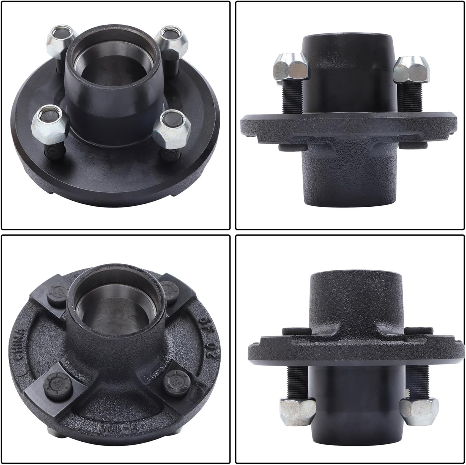 Specifications:Bolt pattern: 4 on 4 inchLoad capacity: 2000lbsL44643 Inner/outer bearing: 1in I.DL44610 Inner/outer race: 1.98in O.DGrease seal: 1.987in x 1.249inGrease cap: 1.986in O.DPackage includes:1 x 4 on 4 inch trailer hub1 x 1 inch BT8 square spindle2 x Inner/outer bearing L446432 x Inner/outer race L446101 x Grease seal (1.987in x 1.249in)1 x Dust cap1 x Spindle nut1 x Spindle Washer4 x 1/2 inch - 20 nuts (already installed on the hub)Note.1: Please install the bearings and oil seals onto the trailer hub before installing the spindle, as direct installation may cause jamming.Note.2: If you insist on directly installing the bearing onto the spindle and it gets stuck, you can use sandpaper to lightly polish it.