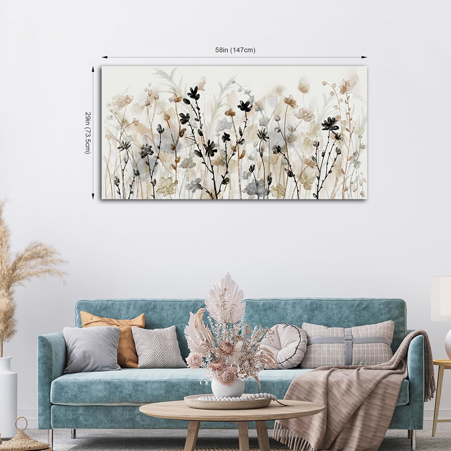 Abstract Floral Wall Art Cream Canvas Prints Simple Life Canvas Pictures Black Cream Brown Elegant Flowers Wall Decor Landscape Painting Artwork Ready to Hang Themes: Nature Picture,Floral Pictures Size: 58"L X 29"W Waterproof: Yes ECO-ink print: Yes UV resistant: Yes Material: Wood and Canvas Type: HD Giclee Printed Packing: Gallery Wrapped,Framed Ready to Hang Transform your space into an art gallery with VEAEE's professionally teal canvas wall art. Crafted by skilled artists, this abstract canvas art brings a splash of color and creativity to your bedroom, living room, or even bathroom decor. Experience the beauty of abstract paintings with VEAEE's exquisite canvas artwork. The large size and carefully selected frame add sophistication and elegance to your living room, making it the perfect conversation starter for guests. VEAEE's framed abstract wall decor combines artistry and style to bring a touch of sophistication to any wall. Whether you choose to display it in your living room, bedroom, or office, this canvas artwork will surely leave a lasting impression. The good idea for any occasion, including weddings, anniversaries, Christmas, Thanksgiving, Mother's Day, Father's Day, Valentine's Day, birthdays, and the New Year. Whether you're looking for a thoughtful and heartfelt present for a loved one or a unique and memorable products for a special occasion, we've got you covered. Please take note that the actual color of our products may slightly different from the images displayed on your screen due to differences in lighting and screen settings. The display pictures are for illustration purposes only. We highly recommend that you carefully measure your wall and choose the right size of canvas artwork that suits your needs. This way, you can ensure the product you receive fits in your space and enhances the visual appeal of your room.