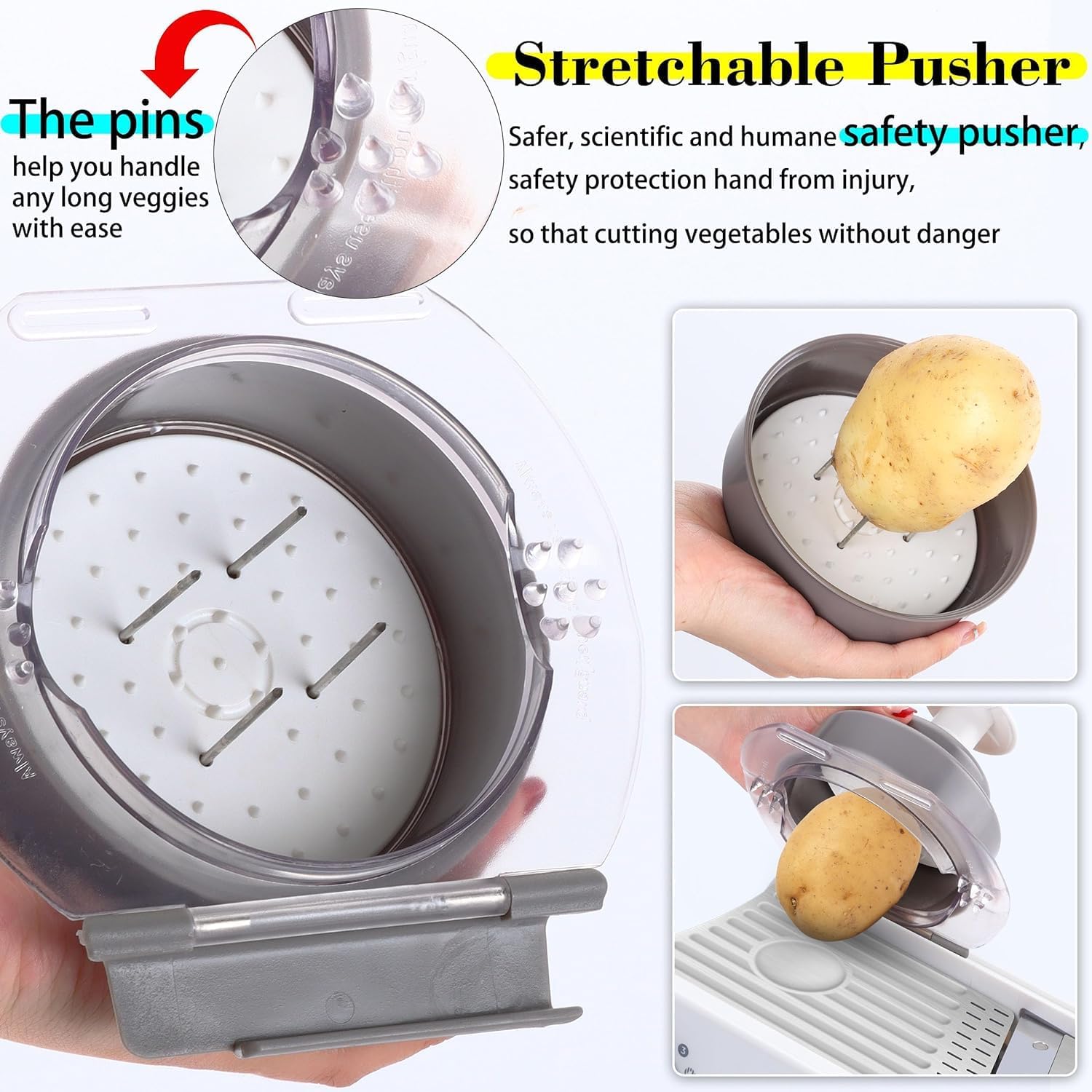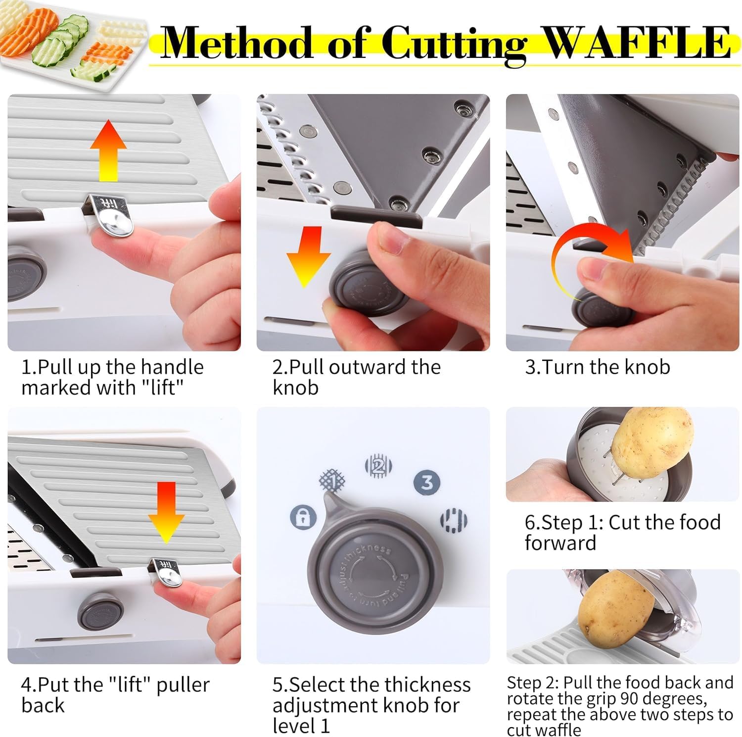 Transform Your Kitchen Experience with Our Premium Mandoline Food Slicer Elevate your culinary skills with our Mandoline Food Slicer, a must-have tool for every kitchen enthusiast. Crafted from high-quality stainless steel, this versatile vegetable chopper offers precision, efficiency, and durability, making meal prep a breeze. Key Features: Stainless Steel Construction: Built to last with a robust stainless steel body, ensuring longevity and rust resistance. Adjustable Slicing Thickness: Customize your slices with ease, from ultra-thin to thick cuts, perfect for any recipe. Multi-functional Design: Not just a mandoline slicer, but also a food chopper and veggie chopper, providing versatile cutting options for vegetables, fruits, and more. French Fry Cutter: Effortlessly create perfectly shaped French fries at home, impressing your family and guests. Waffle Maker: Add a touch of creativity to your meals with our built-in waffle cutter, making beautifully patterned waffle fries and snacks. Safety Features: Equipped with a safety guard and non-slip base to ensure secure and stable slicing, minimizing the risk of accidents. Easy to Clean: Designed for convenience, our mandoline slicer is dishwasher safe, making clean-up quick and hassle-free. Whether you're a professional chef or a home cook, our Mandoline Food Slicer will enhance your kitchen experience, making food preparation faster, safer, and more enjoyable. Say goodbye to tedious chopping and slicing, and hello to perfectly cut ingredients every time.
