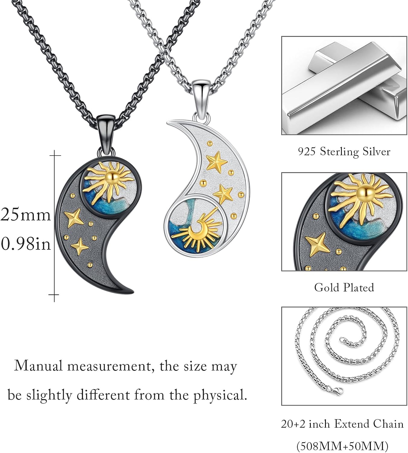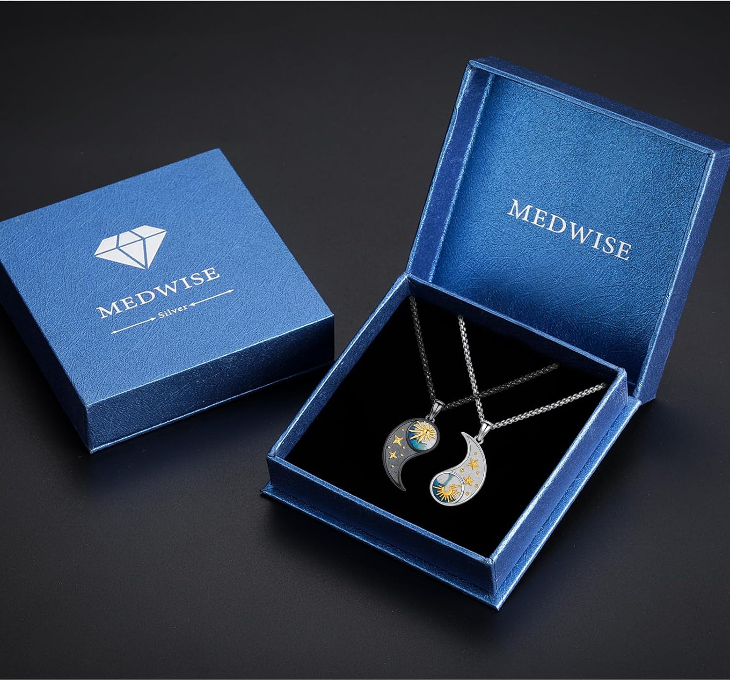 🌟 Welcome to MEDWISE— Where Timeless Elegance Meets Modern Style 🌟Every MEDWISE piece begins with a commitment: Authentic 925 Sterling Silver, Hypoallergenic & Tarnish-Resistant. Born from a passion for transforming everyday moments into heirlooms, our collections blend delicate artistry with enduring quality. Whether it’s a whisper-thin chain for daily elegance or a statement pendant for unforgettable nights, MEDWISE is where modern versatility meets legacy-worthy craftsmanship.✨ Why Choose MEDWISE? ✨1. Authentic 925 Sterling Silver | Hypoallergenic & DurableAll MEDWISE jewelry is crafted from premium 925 sterling silver — a hallmark of purity and longevity. Perfect for sensitive skin, it’s the ideal choice for those who seek beauty without compromise.2. Curated Collections for Every Style: From dainty chains to pendant,Studs, hoops, and drop designs that frame your face with effortless grace.3. This exquisite Sun and Moon Yin Yang necklace set features two complementary pendants crafted from 925 sterling silver with stunning gold-plated celestial details. Each pendant showcases intricate sun and moon designs adorned with golden stars and vibrant blue enamel accents. The contrasting black and silver finishes create a striking yin yang effect that symbolizes balance and harmony. Perfect for couples, best friends, or anyone who appreciates celestial symbolism, this meaningful jewelry set includes two matching necklaces with 20+2 inch extendable chains for comfortable, adjustable wear. Whether it’s a gift for a loved one or a treat for yourself, our pieces are designed to be cherished. Many designs feature customizable elements, like photo locket, turning jewelry into a canvas for your story.🔍 Jewelry Care Guide | Preserve Your MEDWISE Shine 🔍To ensure your treasures last a lifetime: Avoid Chemicals: Remove jewelry before swimming, showering, or applying perfumes/lotions. Gentle Cleaning: Use a soft polishing cloth regularly; for deeper cleans, soak in mild soapy water and pat dry.🛍️ Your Satisfaction, Our Promise 🛍️Every MEDWISE purchase includes:✅ Premium Gift-Ready Packaging✅ 24/7 Customer Support