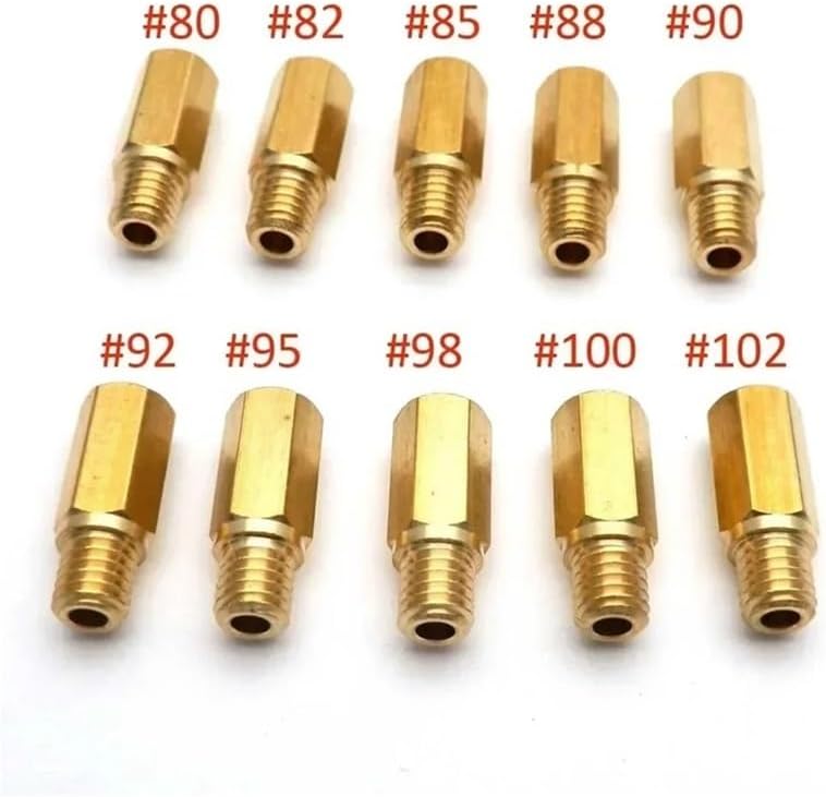 Technical specifications of Main jets1, Size same as KEn 99101-357 Main Jet2, 16.5mm in length with a 6mm Round Head3, Thread: 5mmx0.84, The length of thread: 5mTechinical specifications of Pilot Jet:1, Same size as KEn N424-21 Pilot/Slow Jet2, 28mm in length with a 5mm Round Head3, The diameter of thread is 6mm x 0.754mm main jets for 50cc carb.found on 139QMB 50,60,80cc 4-stroke Scooter/PZ19 carb.Technical specifications:1, Thread: 4x0.7mm2, Total Length: 7mm3, Diameter of head: 5mm4. Size is marked on the jets.5mm Ken main jet kits for GY6 125cc/150cc or CG125cc Motorcycle or ATV, Q, GO KART ETCTechnical specifications:Length: 8mmLength of thread: 5mmDiameter of head: 6mmPackage includes:10x jetsItem Weight : 10gItem Height : 1.65cmModel Name : KEn OKO CVKMaterial : Copper