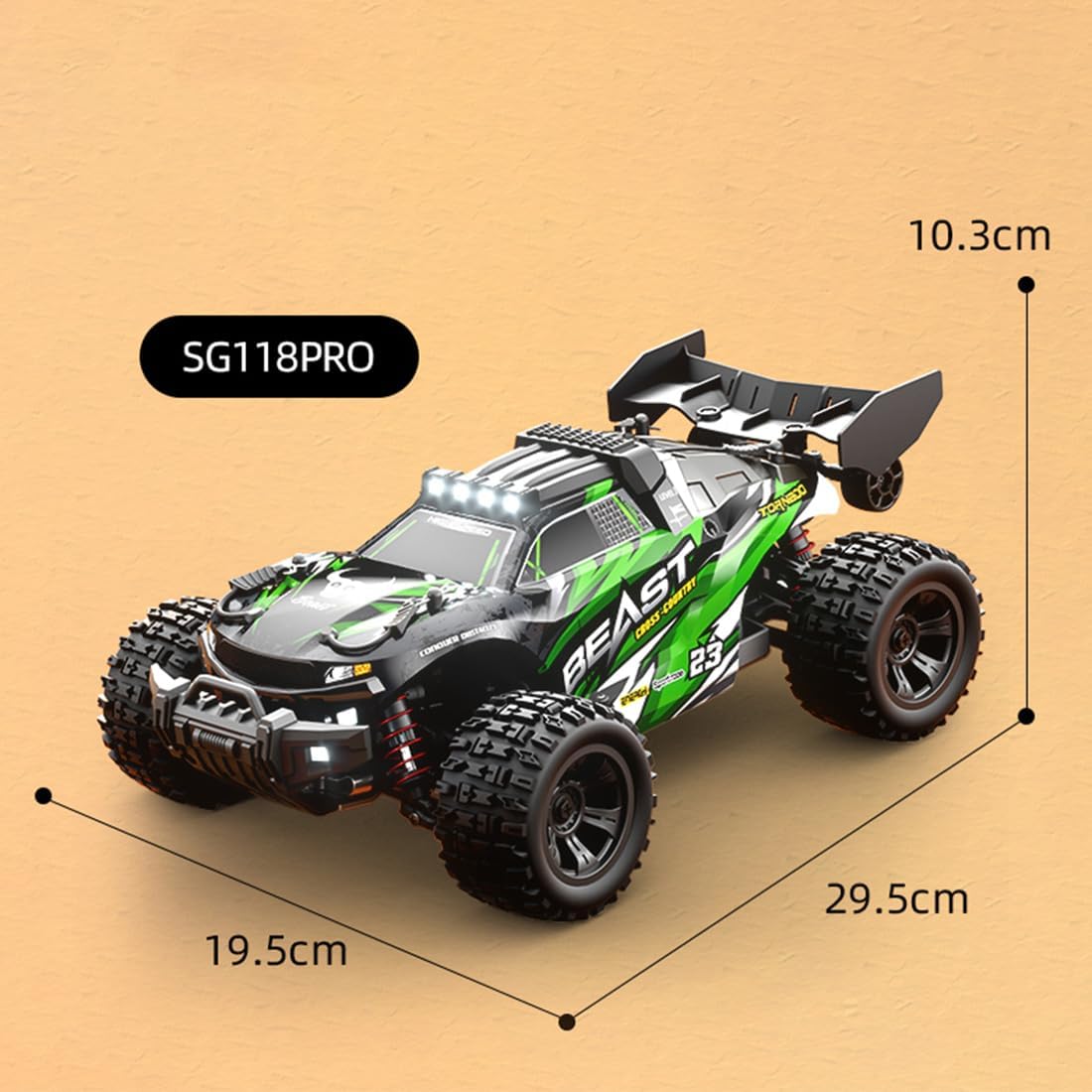 SG118PRO 1/18 Scale Full-Proportional 4WD High-Speed RC Simulation Off-Road Car (Carbon Brush Version/Black and Green)Specifications: .Material: Hardware + Electronics + Plastic .Power Configuration: Carbon Brush .Speed: 35KM/h .ESC: 2S 25A carbon brush ESC .Motor: RC380 carbon brush motor .Servo: 17G five-wire servo .Battery: 7.4V-1500mah lithium battery .Remote controller: 2.4GHz .RC Distance: about 80 meters .Charging time: 3-3.5h .Battery life: 40 minutes .Product Weight: 850g .Package Weight: 1510g .Product Dimensions: 29.5 x 19.5 x 10.3cm .Package Dimensions: 31 x 22.5 x 16.5cm .Packing: BoxPackage Including .RC Car *1 .Remote Controller *1 .Instruction Manual *1 .USB Charger *1 .Shock-Absorbing Adjustment Buckle *1 .Metal Latch*1 .Anti-lost Silicone Buckle *1 .Phillips Screwdriver *1